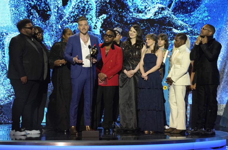 Maverick City Music a Kirk Franklin preberajú cenu za najlepší gospelový album za „Kingdom Book One Deluxe“ na 65. ročníku odovzdávania cien Grammy v nedeľu 5. februára 2023 v Los Angeles. Foto: SITA/AP.