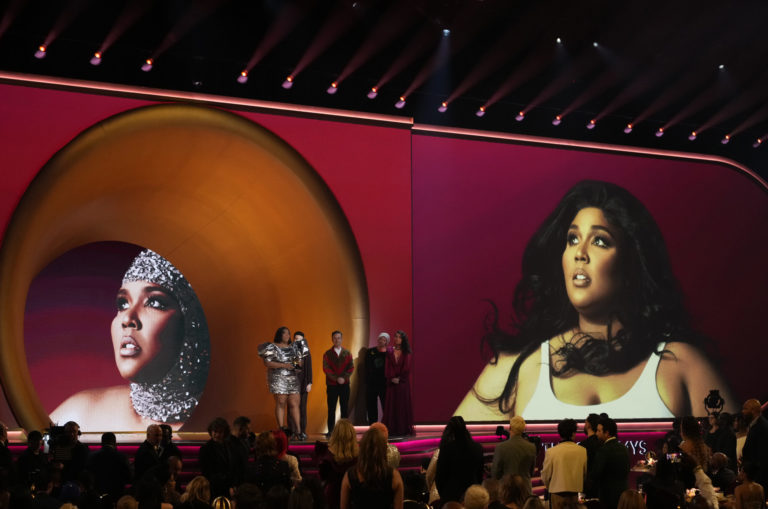 Lizzo preberá cenu za nahrávku roka za skladbu „About Damn Time“ na 65. ročníku odovzdávania cien Grammy v nedeľu 5. februára 2023 v Los Angeles. Foto: SITA/AP.