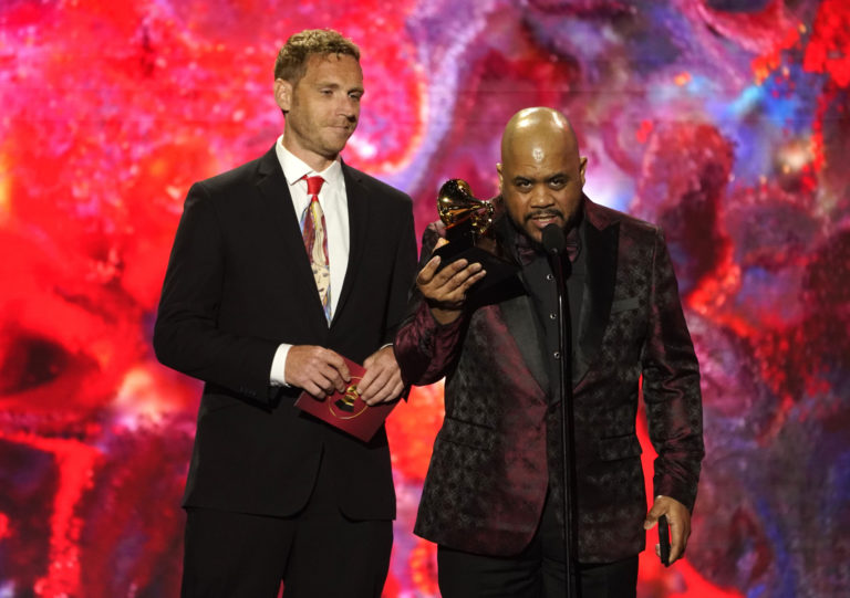 Nic Hard, vľavo, a Jason "JT" Thomas zo Snarky Puppy preberajú cenu za najlepší súčasný inštrumentálny album pre "Empire Central" na 65. ročníku odovzdávania cien Grammy v nedeľu 5. februára 2023 v Los Angeles Foto: SITA/AP.