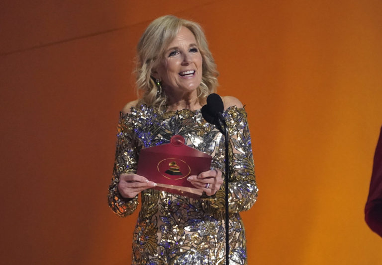 Prvá dáma Jill Biden odovzdáva cenu za pieseň roka na 65. ročníku odovzdávania cien Grammy v nedeľu 5. februára 2023 v Los Angeles. Foto: SITA/AP.