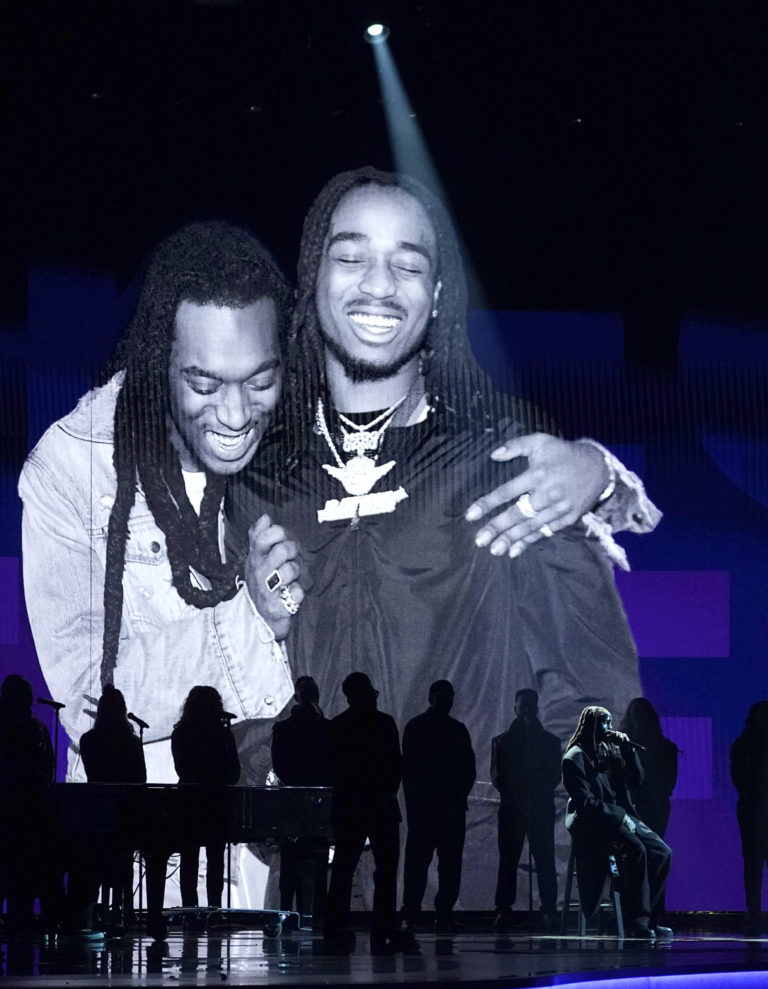 Quavo a Maverick City Music vystupujú „Without You“ počas vzdávania pocty Takeoffovi, zosnulému rapperovi a členovi skupiny Migos, na 65. ročníku odovzdávania cien Grammy v nedeľu 5. februára 2023 v Los Angeles Foto: SITA/AP.