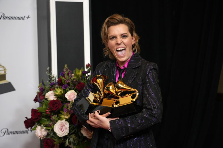 Brandi Carlile, víťazka cien za najlepšiu rockovú pieseň za skladbu „Broken Horses“, najlepší americký album za album „In These Silent Days“ a najlepší rockový výkon za skladbu „Broken Horses“, pózuje v nedeľu v tlačovej miestnosti na 65. ročníku odovzdávania cien Grammy. 5. februára 2023 v Los Angeles. Foto: SITA/AP.