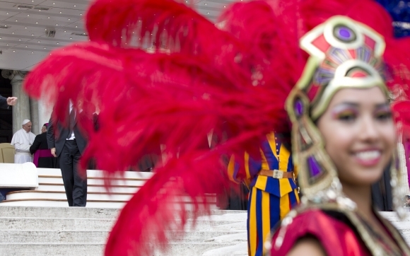 Pápež František zdraví biskupov oblečených do tradičných mexických tanečných kostýmov pred Bazilikou Svätého Petra vo Vatikáne. Foto: SITA/AP