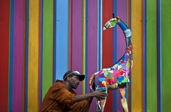 Umelec Jackson Mbatha dokončuje sochu žirafy, vyrobenú zo zvyškov destských sandálikov, ktoré vyzbierala spoločnosť Ocean Sole na plážach v Keni. Firma čistí africké pláže od znečistenia. Foto: SITA/AP