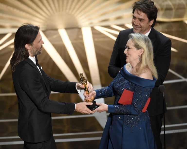 Meryl Streep odovzdáva Oscara v kategórii Kamera, v ktorej triumfoval Linus Sandgren (La La Land). Los Angeles, 26. február 2017. Foto: Chris Pizzello/Invision/AP