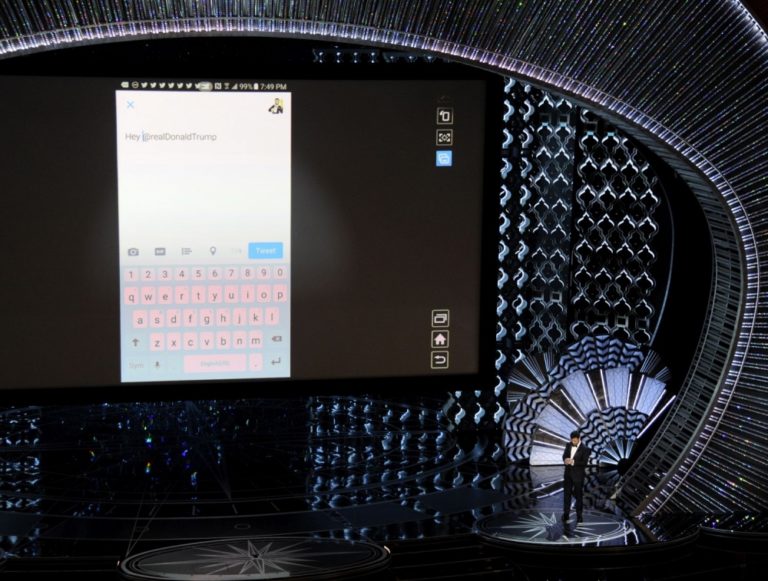 Moderátor galavečera Jimmy Kimmel tweetuje prezidentovi Donaldovi Trumpovi počas slávnostného udeľovania Oscarov v Dolby Theatre. Los Angeles, 26. február 2017. Foto: Jordan Strauss/Invision/AP