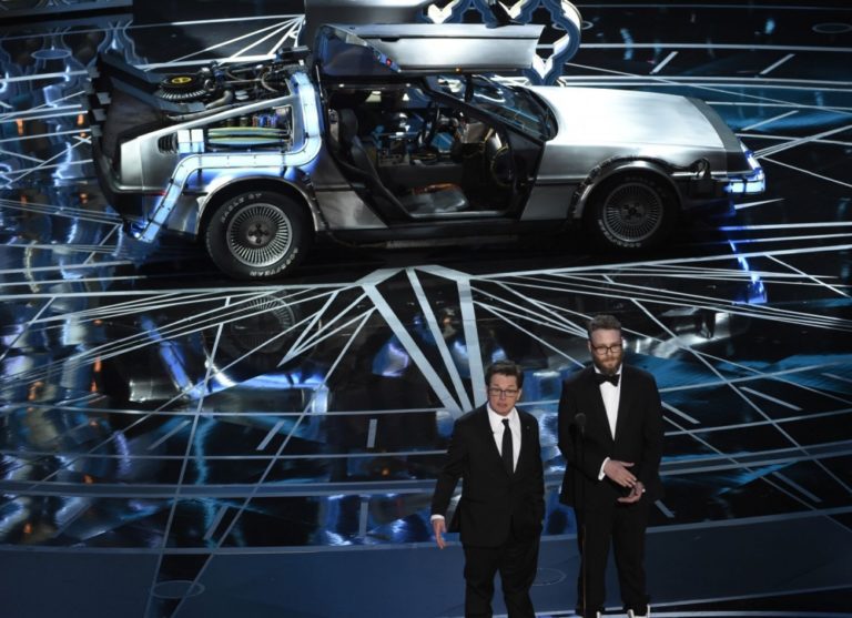 Seth Rogen (vpravo) a Michael J. Fox počas slávnostného udeľovanie Oscarov v Dolby Theatre. Los Angeles, 26. február 2017. Foto: Chris Pizzello/Invision/AP