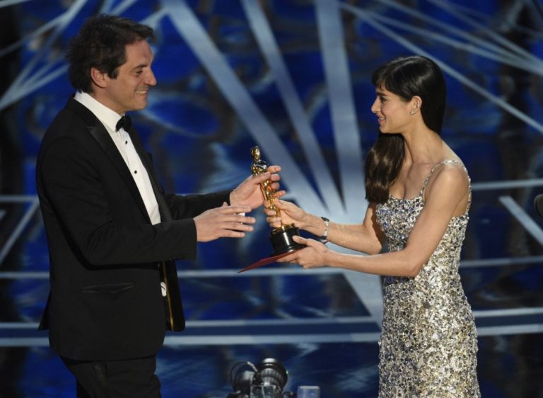Sofia Boutella odovzdáva Oscara v kategórii Strih zvuku, v ktorej triumfoval Sylvain Bellemare. Los Angeles, 26. február 2017. Foto: Chris Pizzello/Invision/AP