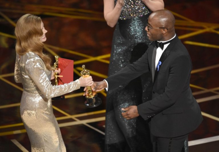 Amy Adams odovzdáva Oscara Barrymu Jenkinsovi v kategórii Adaptovaný scenár. Los Angeles, 26. február 2017. Foto: Chris Pizzello/Invision/AP