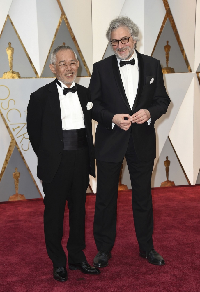 Zľava: Toshio Suzuki a Michael Dudok prichádzajú na udeľovanie Oscarov. Los Angeles, 26. február 2017. Foto: Jordan Strauss/Invision/AP