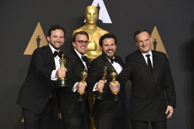 Zľava: V kategórii Vizuálne efekty Oscara získali Dan Lemmon Andrew R. Jones, Adam Valdez a Robert Legato. Los Angeles, 26. február 2017. Foto: Jordan Strauss/Invision/AP