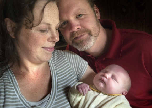 Rodičia Jay a Kateri Schwandt z Michiganu pózujú s čerstvo narodeným synom Tuckerom. Ten je v poradí dvanástym dieťaťom šťastného páru, pričom všetky deti sú chlapci. Foto: SITA/AP