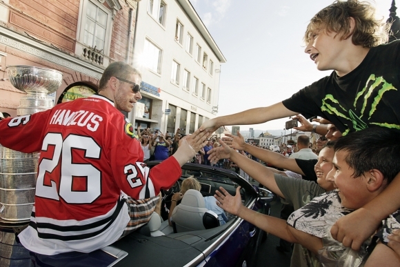 Michal Handzuš sa zdraví s fanúšikmi počas osláv príchodu Stanleyho pohára na Slovensko na námestí SNP v Banskej Bystrici. Námestie zaplnilo zruba 6000 ľudí. Foto: SITA/Ján Viazanička