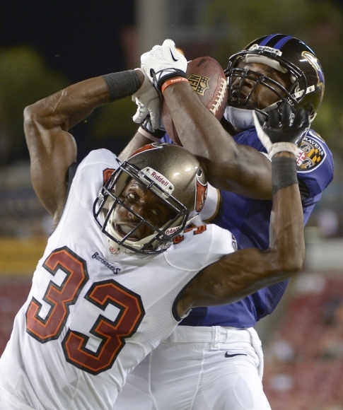 Zakončovateľ tímu Baltimore Ravens Aaron Mellette dáva 21-jardový touchdown aj napriek snahe obrancu tímu Tampa Bay Buccaneers Deveron Carr s číslom 33 v zápase NFL. Foto: SITA/AP