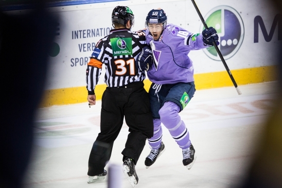 Miroslav Šatan pri divokej oslave svojho druhého gólu v zápase KHL medzi Slovanom a Lokomotivom Jaroslavľ takmer zbúral rozhodcu. Foto: SITA/Jozef Jakubčo