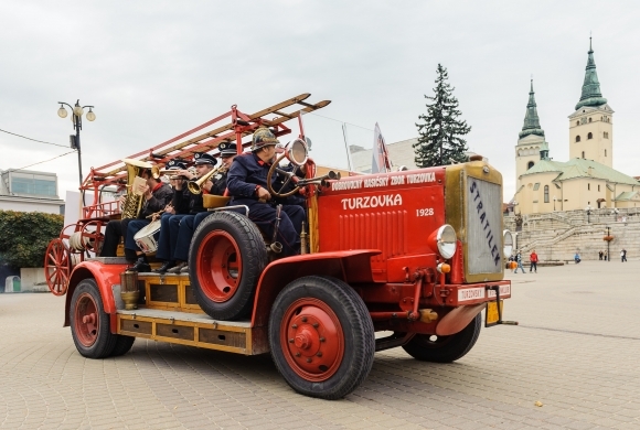Historické hasičské vozidlo Škoda 505 z roku 1928 na Hlinkovom námestí. Vozidlo bolo súčasťou sprievodu historických vozidiel mestom Žilina počas Záchranárskych dní pre celú rodinu. Foto: SITA/Milo Fabian