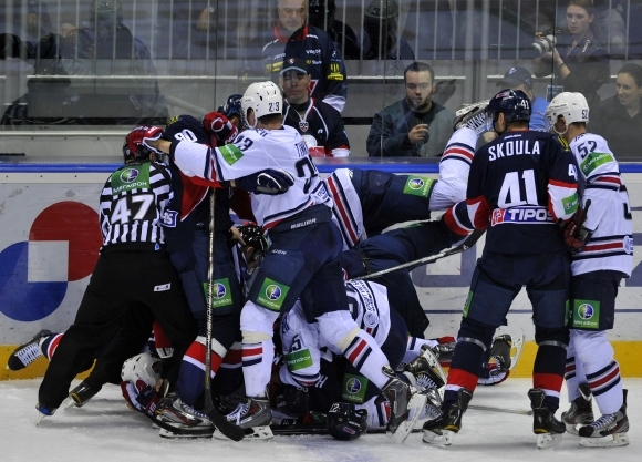 Hráči Slovana Bratislava vyhrali v zápase KHL nad silným Metallurgom Magnitogorsk 4:3 po predĺžení. Na ľade sa neraz poriadne iskrilo. Foto: SITA/Ján Slovák