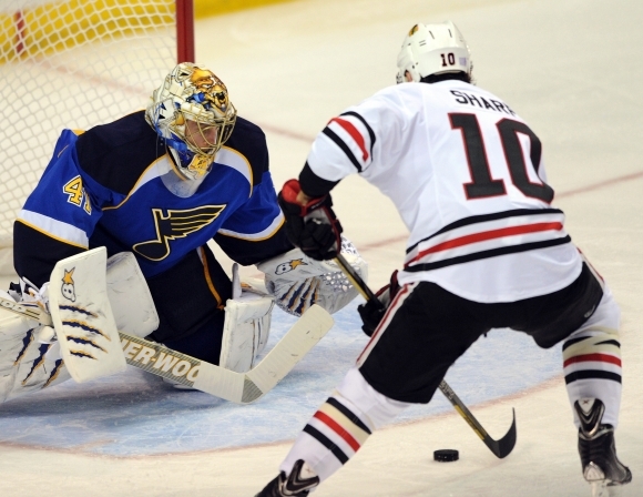 Hokejový brankár Jaroslav Halák vychytal pre St. Louis Blues víťazstvo 3:2 nad obhajcom Stanleyho pohára Chicagom Blackhawks a stal sa aj prvou hviezdou duelu. Neprekonali ho ani rodáci Hossa s Handzušom Foto: SITA/AP