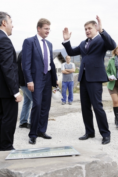 Premiér Robert Fico (vpravo) počas slávnostného poklepania základného kameňa Integrovaného projektu rybej farmy a skleníkového hospodárstva v areáli bane Handlová. Foto: SITA/Ján Viazanička