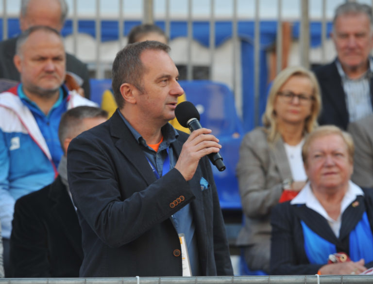 Prezident Medzinárodného maratónu mieru Ján Sudzima pri slávnostnom otvorení 95. ročníka Medzinárodného maratónu mieru v Košiciach. Košice, 7. október 2018. Foto: SITA/Viktor Zamborský