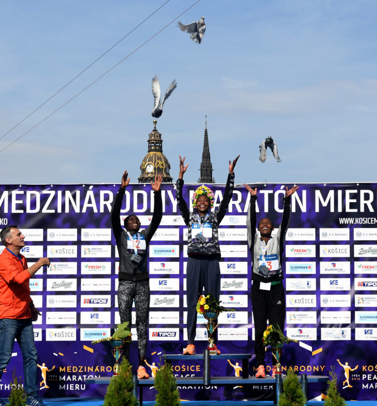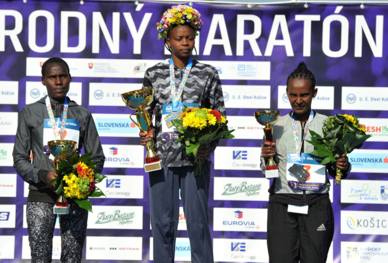 Zľava: Sheila Jerotich z Kene (2. miesto), Milliam Naktar Ebongon z Kene (1. miesto) a Jemila Wortesa Shure z Etiópie (3. miesto) počas slávnostného vyhlasovania víťazov 95. ročníka Medzinárodného maratónu mieru v Košiciach. Košice, 7. október 2018. Foto: SITA/Viktor Zamborský