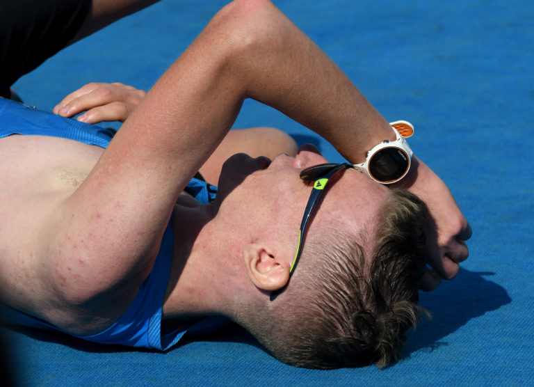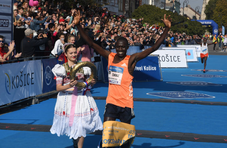 Víťaz 95. ročníka Medzinárodného maratónu mieru v Košiciach Keňan Raymond Choge v cieli. Košice, 7. október 2018. Foto: SITA/Viktor Zamborský