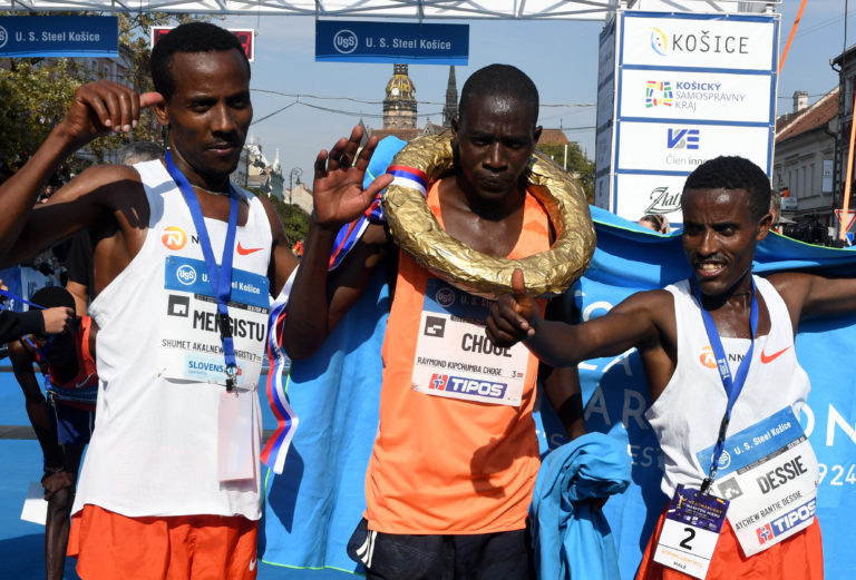 Zľava: Shumet Mengistu z Etiópie (3. miesto), Raymond Choge z Kene (1. miesto) a Aychev Bantie Dessie z Etiópie (2. miesto) počas 95. ročníka Medzinárodného maratónu mieru v Košiciach. Košice, 7. október 2018. Foto: SITA/Viktor Zamborský