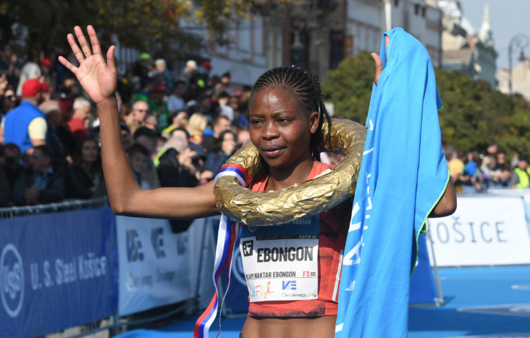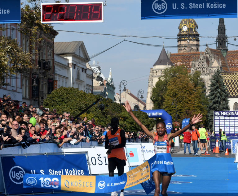 Víťazka 95. ročníka Medzinárodného maratónu mieru v Košiciach Milliam Naktar Ebongon z Kene v cieli. Košice, 7. október 2018. Foto: SITA/Viktor Zamborský