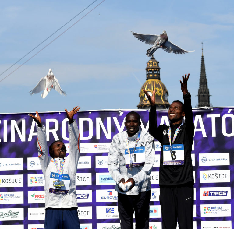 Zľava: Shumet Mengistu z Etiópie (3. miesto), Raymond Choge z Kene (1. miesto) a Aychev Bantie Dessie z Etiópie (2. miesto) počas počas slávnostného vyhlasovania víťazov 95. ročníka Medzinárodného maratónu mieru v Košiciach. Košice, 7. október 2018. Foto: SITA/Viktor Zamborský
