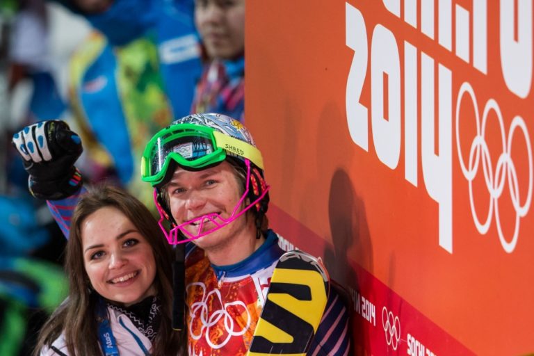 Sprava: Slovenský reprezentant v alpskom lyžovaní Adam Žampa s priateľkou v cieli druhého kola slalomu mužov na ZOH 2014 v Soči. Foto: SITA/Jozef Jakubčo