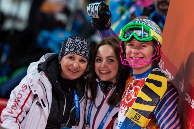 Sprava: Slovenský reprezentant v alpskom lyžovaní Adam Žampa s priateľkou a mamou v cieli druhého kola slalomu mužov na ZOH 2014 v Soči. Foto: SITA/Jozef Jakubčo
