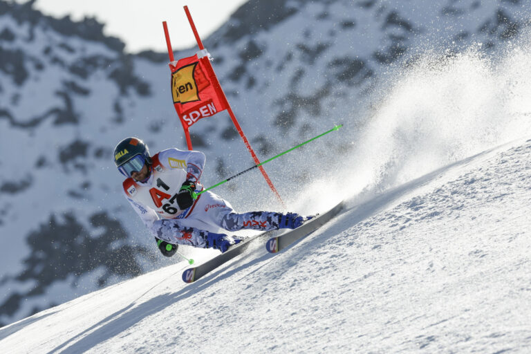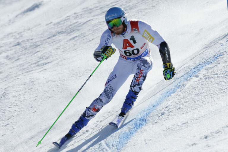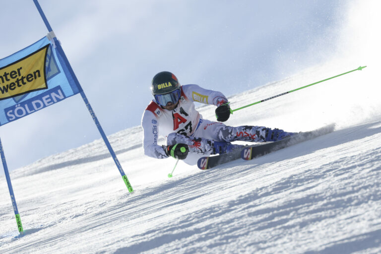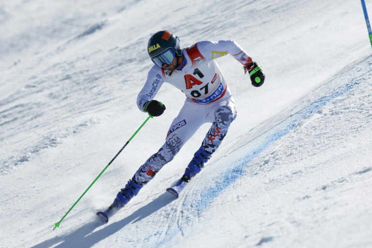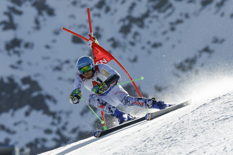 Slovenský lyžiar Andreas Žampa sa rúti dole traťou počas obrovského slalomu Svetového pohára v alpskom lyžovaní v rakúskom Söldene v nedeľu 27. októbra 2024. Foto: SITA/AP