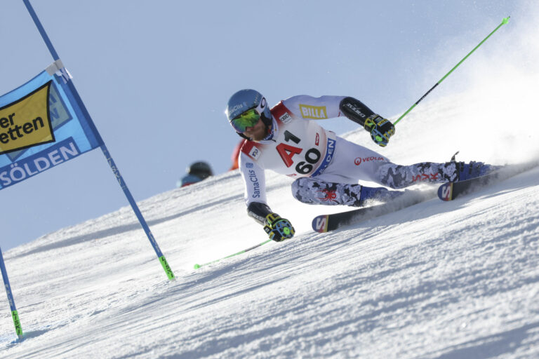 Slovenský lyžiar Adam Žampa sa rúti dole traťou počas obrovského slalomu Svetového pohára v alpskom lyžovaní v rakúskom Söldene v nedeľu 27. októbra 2024. Foto: SITA/AP