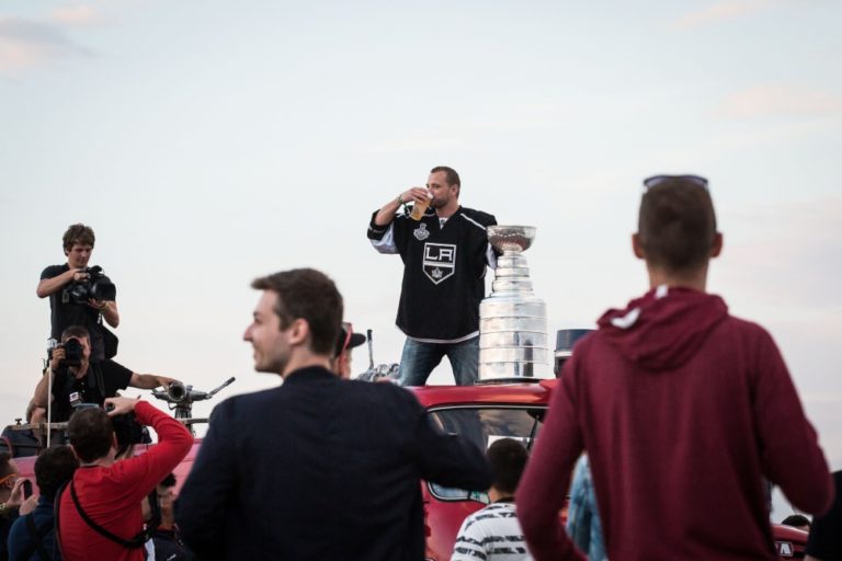 Slovenský hokejista a hráč víťazneho tímu NHL Los Angeles Kings v sezóne 2013/2014 Marián Gáborík (uprostred) počas prezentácie trofeje Stanley Cup na festivale Pohoda. Trenčín, 11. júl 2014. Foto: SITA/Jozef Jakubčo