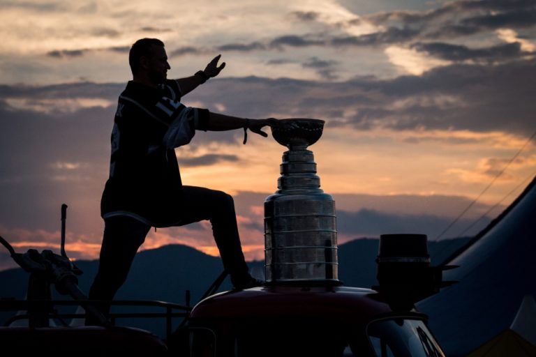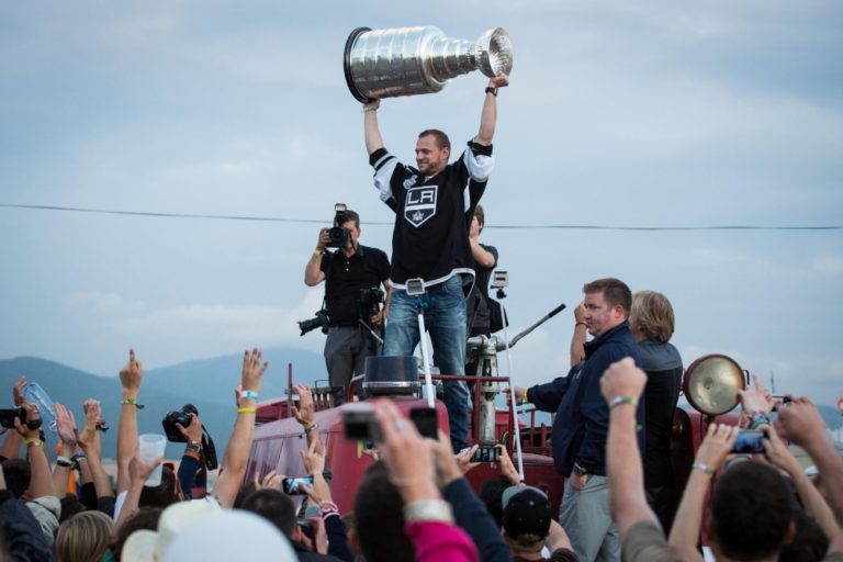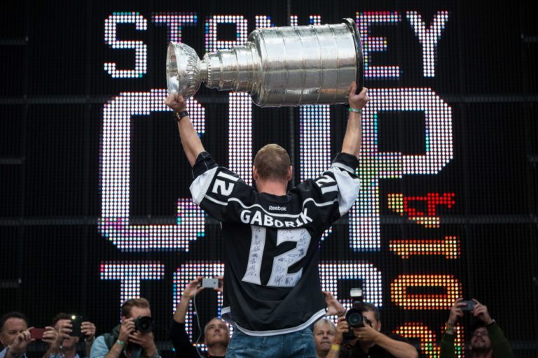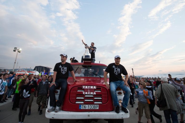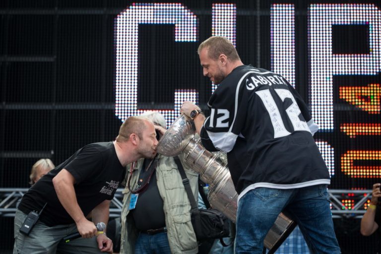 Slovenský hokejista a hráč víťazneho tímu NHL Los Angeles Kings v sezóne 2013/2014 Marián Gáborík (druhý sprava) počas prezentácie trofeje Stanley Cup na festivale Pohoda. Trenčín, 11. júl 2014. Foto: SITA/Jozef Jakubčo