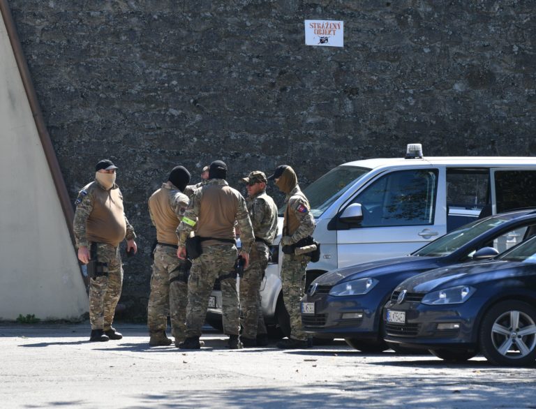 Príslušníci Zväzu justičnej a väzenskej stráže (ZVJS) pred hlavným vstupom do väznice v Leopoldove po vynesení rozsudku z pojednávania v kauze vraždy Jána Kuciaka a Martiny Kušnírovej na Špecializovanom trestnom súde v Pezinku, na ktorom súd nariadil prepustenie Aleny Zsuzsovej z väzby na slobodu. Leopoldov, 3. september 2020. Foto: SITA/Martin Medňanský