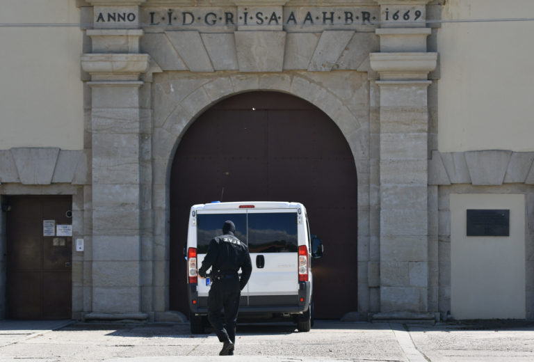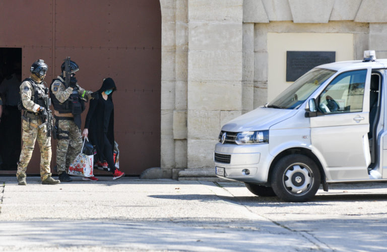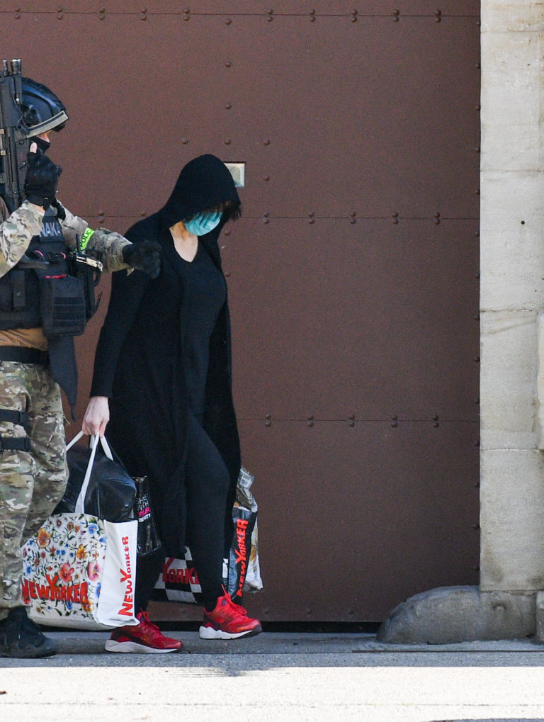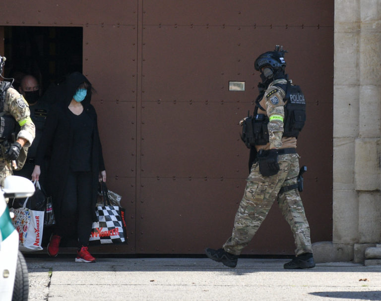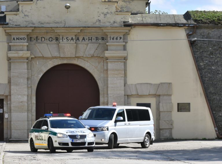 Policajná eskorta pred vstupom do väznice v Leopoldove po vynesení rozsudku z pojednávania v kauze vraždy Jána Kuciaka a Martiny Kušnírovej na Špecializovanom trestnom súde v Pezinku, na ktorom súd nariadil prepustenie Aleny Zsuzsovej z väzby na slobodu. Leopoldov, 3. september 2020. Foto: SITA/Martin Medňanský