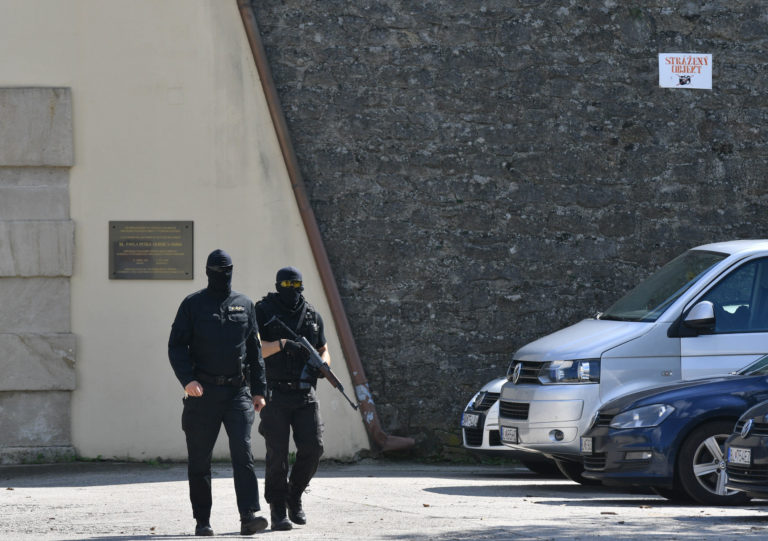 Policajti čakajú pred vstupom do väznice v Leopoldove na prepustenie Aleny Zs. z väzby na slobodu po vynesení rozsudku z pojednávania v kauze vraždy Jána Kuciaka a Martiny Kušnírovej na Špecializovanom trestnom súde v Pezinku. Leopoldov, 3. september 2020. Foto: SITA/Martin Medňanský