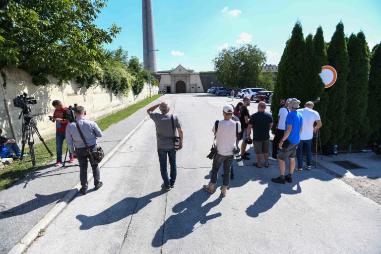 Noviári čakajú pred hlavným vstupom do väznice v Leopoldove po vynesení rozsudku z pojednávania v kauze vraždy Jána Kuciaka a Martiny Kušnírovej na Špecializovanom trestnom súde v Pezinku, na ktorom súd nariadil prepustenie Aleny Zsuzsovej z väzby na slobodu. Leopoldov, 3. september 2020. Foto: SITA/Martin Medňanský