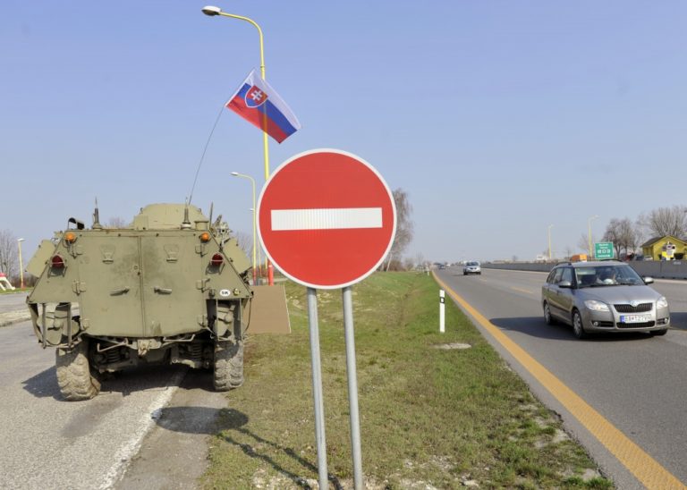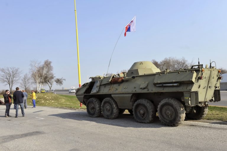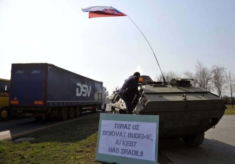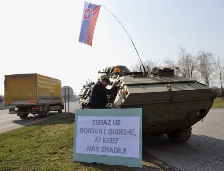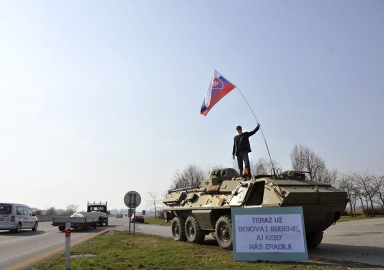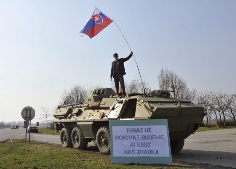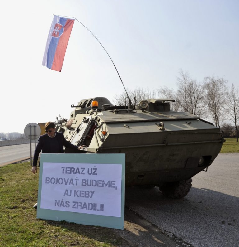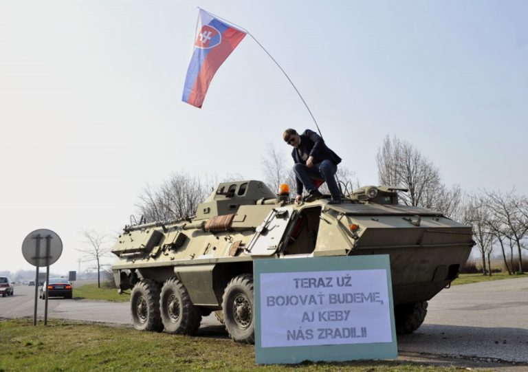 Nezaradený poslanec Alojz Hlina počas akcie, kedy ako reakciu na udalosti u našich východných susedov a symbolický odkaz pre prípadného agresora nechal doviezť na diaľničné odpočívadlo na príjazde do Bratislavy obrnený transportér a nechal sa pri ňom odfotiť s nápisom: Teraz už bojovať budeme, aj keby nás zradili. Triblavina, 12. marec 2014. Foto: SITA/Ján Slovák