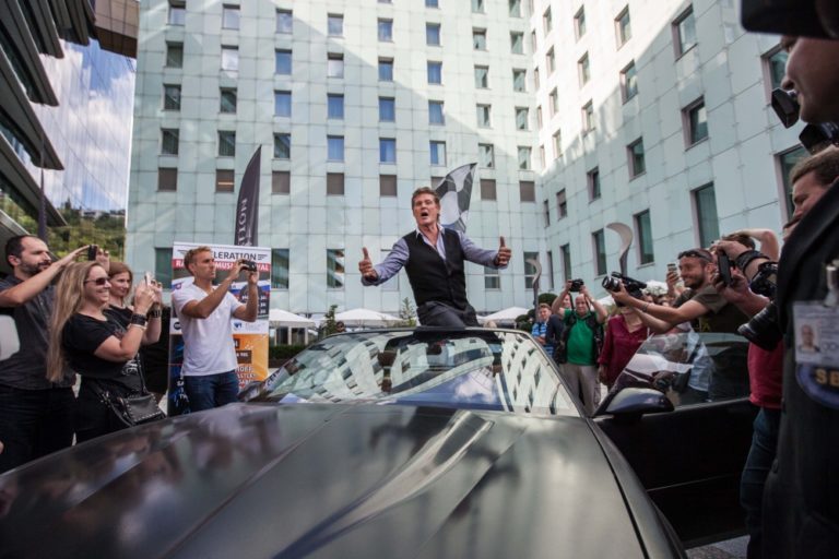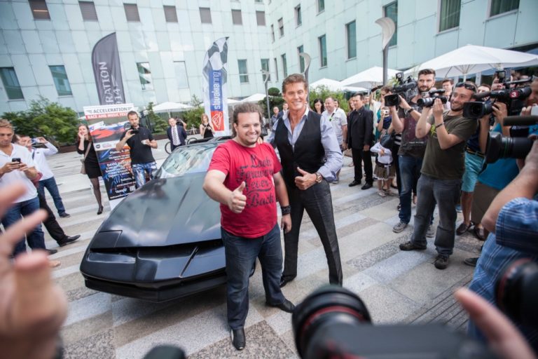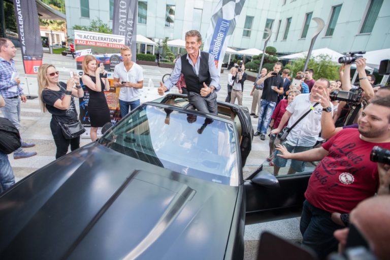 Americký filmový herec a spevák David Hasselhoff a replika svetoznámeho auta KITT zo seriálu Knight Rider počas fototermínu po TK hudobno-motoristického podujatia Acceleration 2014 (Slovakia Ring). Bratislava, 3 júl 2014. Foto: SITA/Katarína Acélová