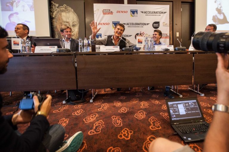 Americký filmový herec a spevák David Hasselhoff (v strede) počas tlačovej konferencie hudobno-motoristického podujatia Acceleration 2014 (Slovakia Ring). Bratislava, 3 júl 2014. Foto: SITA/Katarína Acélová