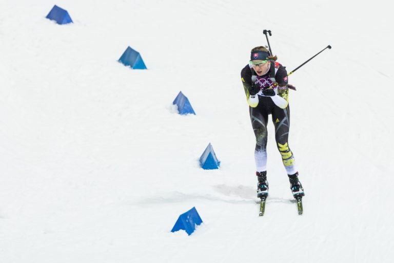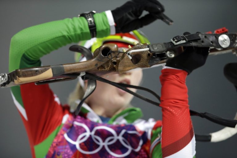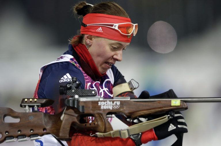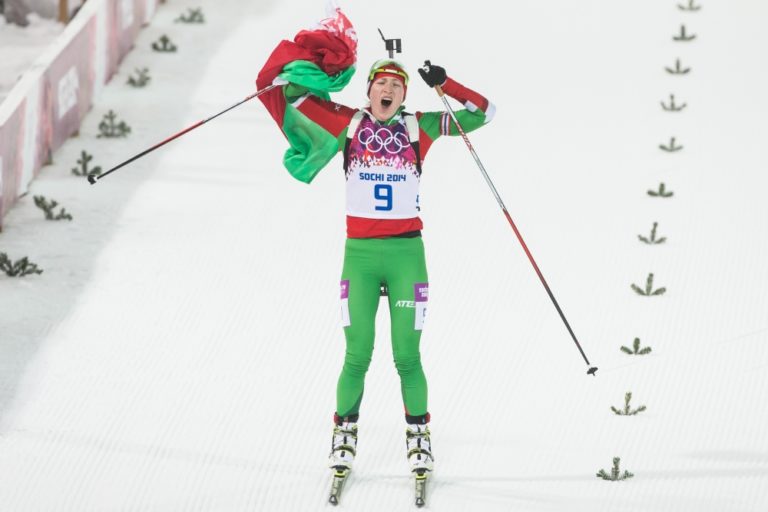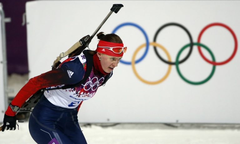 Bieloruská reprezentantka v biatlone Daria Domračevová počas stíhacích biatlonových pretekov žien na ZOH 2014 v Soči. Rusko, Soči, 11. február 2014. Foto: SITA/Jozef Jakubčo