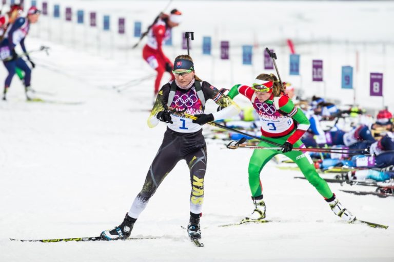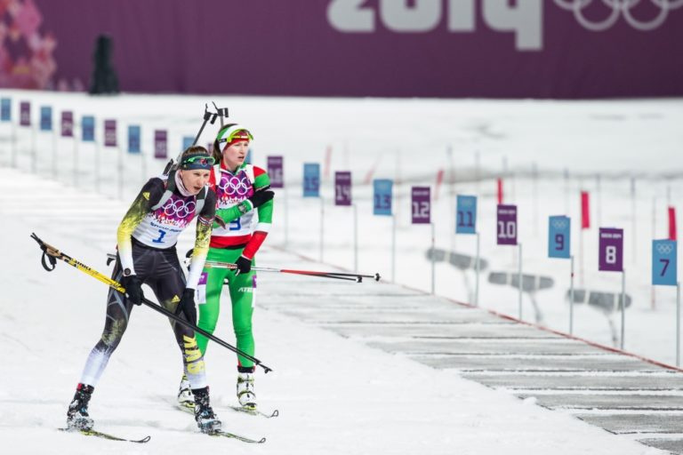 Zľava: Slovenská reprezentantka v biatlone Anastasia Kuzminová a Bieloruska Daria Domračevová očas stíhacích biatlonových pretekov žien na ZOH 2014 v Soči. Rusko, Soči, 11. február 2014. Foto: SITA//Jozef Jakubčo
