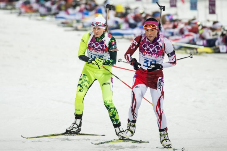 Slovenská reprezentantka v biatlone Jana Gereková (vľavo) počas stíhacích biatlonových pretekov žien na ZOH 2014 v Soči. Rusko, Soči, 11. február 2014. Foto: SITA/Jozef Jakubčo