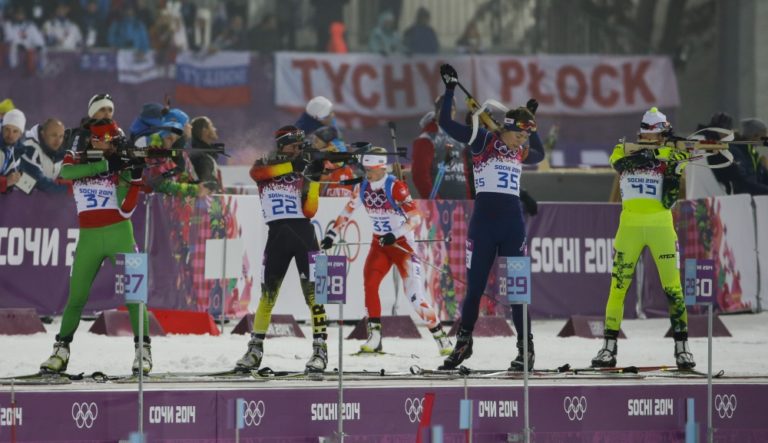 Biatlonistky na stíhacích pretekoch na desať kilometrov v Soči. Foto: SITA/AP