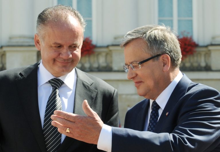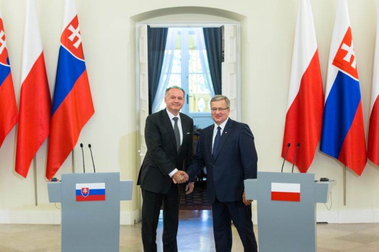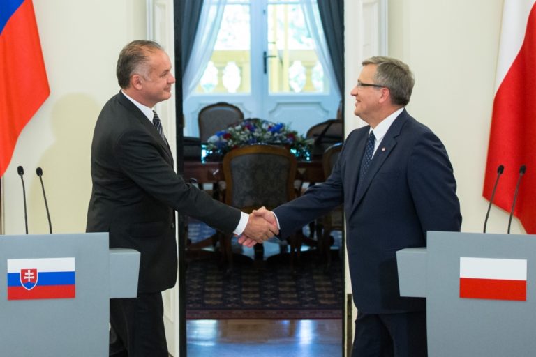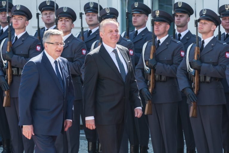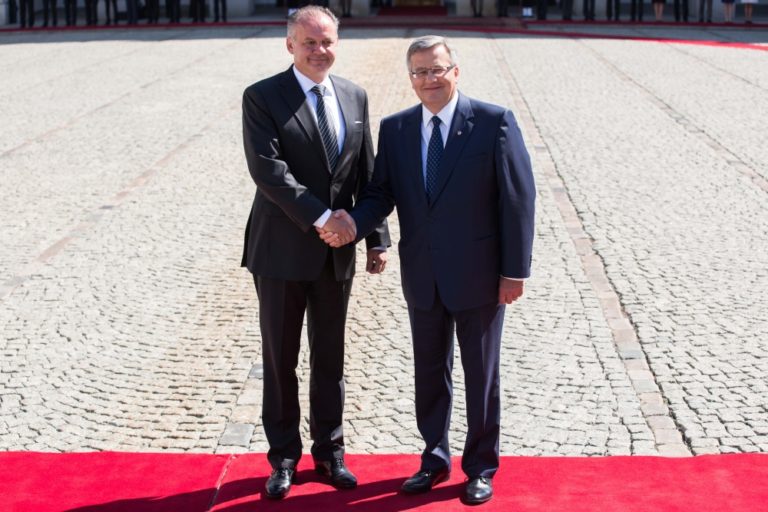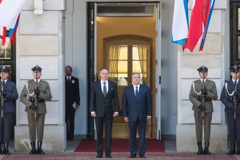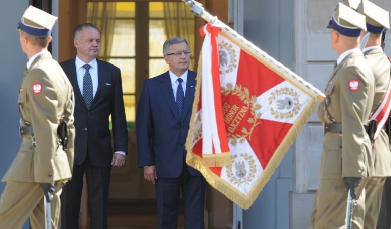 Zľava: Prezident SR Andrej Kiska a prezident Poľska Bronislaw Komorowski pri príležitosti návštevy prezidenta SR v Poľsku. Poľsko, Varšava, 15. júl 2014. Foto: SITA/Jozef Jakubčo