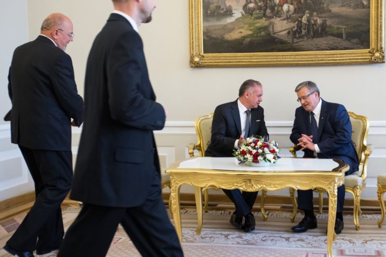 Zľava: Prezident SR Andrej Kiska a prezident Poľska Bronislaw Komorowski počas oficiálneho stretnutia pri príležitosti návštevy prezidenta SR v Poľsku. Poľsko, Varšava, 15. júl 2014. Foto: SITA/Jozef Jakubčo
