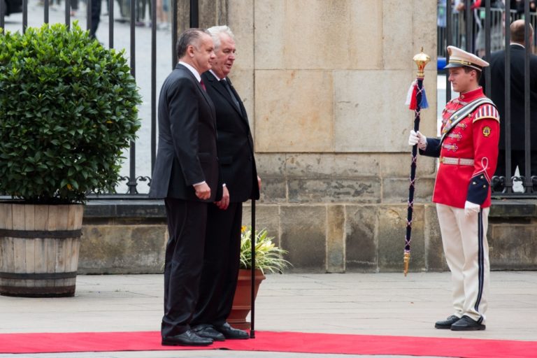 Zľava: Prezident ČR Miloš Zeman a prezident SR Andrej Kiska počas oficiálneho privítacieho ceremoniálu pri príležitosti návštevy prezidenta SR v Českej republike. Praha, Česká republika, 9. júl 2014. Foto: SITA/Jozef Jakubčo