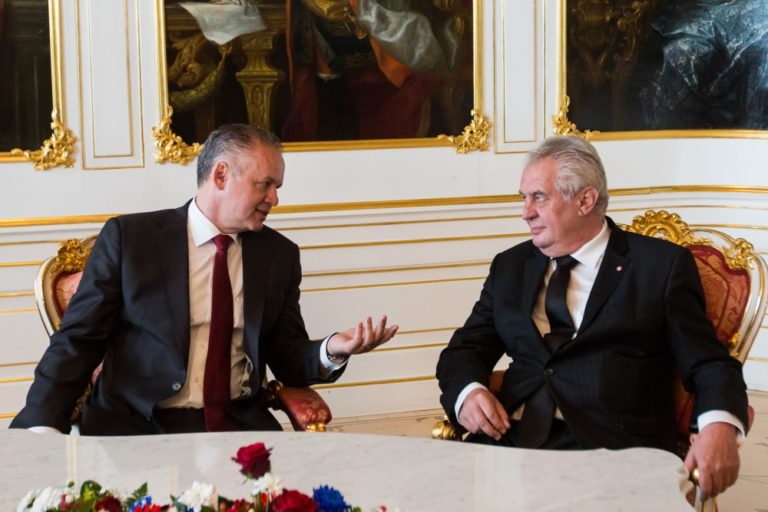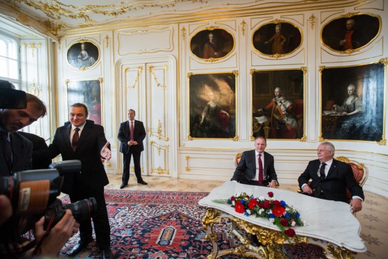 Sprava: Prezident ČR Miloš Zeman a prezident SR Andrej Kiska počas dvojstranného stretnutia pri príležitosti návštevy prezidenta SR v Českej republike. Praha, Česká republika, 9. júl 2014. Foto: SITA/Jozef Jakubčo